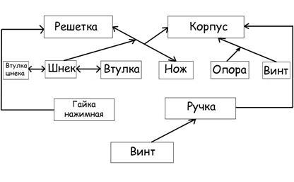 Данная техническая система (рис 2) состоит из: Винта 1,который с помощью опоры 2 крепится к столу, рукоятки 2, закрепленной с помощью винта 4 со шнеком 9,последний вращается во втулке 5 и шнека 11, на конце шнека закреплены нож 7 и решетка 8, которые в свою очередь вращаются и затянуты нажимной гайкой 6. Нажимной механизм (крышка) 12 закреплен в верхней части мясорубки и способствует прижиму (придавливанию) мяса, продуктов и т.д.