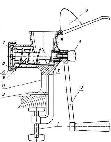 Винт 1, который с помощью опоры 3 крепится к столу; рукоятки 2, закрепленной с помощью винта 4 со шнеком 9; последний вращается в тулке 5 и втулке шнека 11; на конце шнека 9 закреплены нож 7 и решетка 8, которые в свою очередь в месте со шнеком 9 фиксируются нажимной гайкой 6.