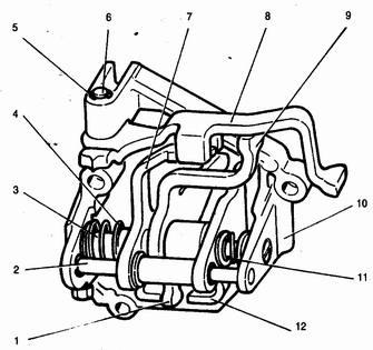 1 - рычаг выбора передач (переднего хода); 2 - направляющая ось блокировочных скоб; 3 - ось рычага выбора передач; 4,11 - пружина; 5 - стопорное кольцо; 6 - ось вилки заднего хода; 7,12 - блокировочные скобы; 8 - вилка включения заднего хода; 9 - рычаг выбора передач (заднего хода); 10 - корпус механизма выбора передач