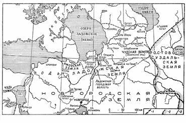 Ладожская земля в конце X — начале XIII в. Граници показаны схематически (основа карты по А. М. Насонову).