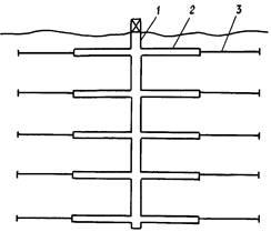 1- ствол шахты; 2 – горизонтальные горные выработки;