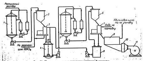 Немецкие специалисты предлагают способ регенерации адипиновой кислоты из маточных растворов, образующихся при получении технической адипиновой кислоты (24). Водный раствор адипиновой кислоты при температуре 30-60°С смешивают с таким количеством адипиновой кислоты, чтобы содержание НNО3