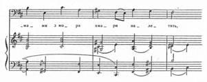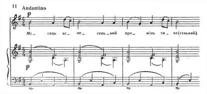 Починається романс не з тоніки, а з VIступеня. Специфічну барву вносять септакордові структури, плагальні звороти. Завершується перша фраза на тоніці, яка з'являється на слабій долі. У фортепіанній партії звучить канонічна імітація. Отже, складність образу, його психологічна насиченість створюється комплексом засобів. У такому ж ключі витримується весь романс – мелодія розгортається невеликими за амплітудою побудовами, в гармонії зустрічаємо ряд септакордів, плагальних зворотів, незмінним залишається і фактурний, акомпануючий пульс (синкопами) та канонічна імітація в приму.