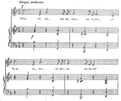 У романсі «Гетьте, думи, ви хмари осінні» на вірші Лесі Українки композитор створив образ мужньої людини, що гордо перемагає смуток і негоди. Крайнім частинам твору властива маршовість. Пунктирний ритм мелодії вокальної партії, надаючи, музиці рішучості й сили, підтримується синкопованими акордами фортепіано (Додаток 11).