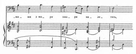 Зерном музичного образу є перша фраза романсу. На фоні синкопованого акомпанементу вступає партія вокалу. Мелодія має секстовий діапазон (від VI ступеня до І), в ній виділяється виразна малосекундова інтонація, а також низхідний рух по звуках мінорного триззука. Ці скромні мелодичні звороти набувають ще більшої переконливості завдяки ладо-гармонії (Додаток 7).