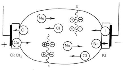 При электрофорезе образуется сложная цепь из растворов, которыми пропитаны прокладки, и электролитов (в основном хлорида натрия), входящих в состав тканей организма. При этом ионы или заряженные частицы соответствующего знака из раствора, которым смочена прокладка, переходят в подлежащие ткани организма, а из тканей организма навстречу им поступают ионы натрия или хлора.