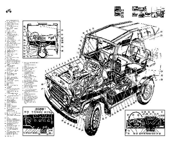 из книги Э.Н. Орлова и Е.Р. Варченко "Автомобили УАЗ" техническое обслуживание и ремонт Первые полноприводные автомобили ГАЗ-69 и ГАЗ-69А повышенной проходимости Ульяновский автомобильный завод начал выпускать в 1954 г. ГАЗ-69 - это грузопассажирский автомобиль с колесной формулой 4х4 для перевозки людей и грузов по всем видам дорог и бездорожью. Автомобиль рамной конструкции, классической компоновки (с передним расположением двигателя) с цельнометаллическим двухдверным кузовом, восьмиместный с продольным расположением задних сидений. Кузов закрыт тентом из прорезиненной ткани. Для работы в зимних условиях в автомобиле предусмотрен отопитель. Автомобиль может буксировать прицеп полной массой до 850 кг. Автомобиль ГАЗ-69А отличается от автомобиля ГАЗ-69 только тем, что имеет четырехдверный кузов, поперечное расположение заднего трехместного сиденья и предназначен для перевозки 5 чел. и 50 кг груза в багажнике. Простота конструкции, удобство обслуживания, надежность в эксплуатации и универсальность позволили этим автомобилям очень быстро завоевать признание на отечественном и международном рынке. В 1958 г. завод освоил новое семейство автомобилей УАЗ-450 повышенной проходимости (фургон, санитарный автомобиль и грузовик). При их создании основные узлы шасси были использованы от автомобиля ГАЗ-69, но компоновка этих автомобилей была оригинальной, в дальнейшем получившая название вагонной. Рабочее место водителя и место пассажира были размещены над передними колесами, что позволило увеличить объем закрытого цельнометаллического кузова до 5 м3, а применение усиленной подвески и новых более мощных шин (8,40-15) позволило поднять грузоподъемность этих автомобилей. При всех достоинствах автомобили ГАЗ-69 и УАЗ-450 имели и недостатки: не хватало мощности двигателя, а форсировать его по частоте вращения коленчатого вала и степени сжатия не позволяло нижнее расположение привода клапанов; рама была технологически сложная и недостаточно прочная; были недоработки у трехскоростной коробки передач, рычажных амортизаторов и других узлов. В 1966 г. завод освоил новое семейство автомобилей УАЗ-452 вагонной компоновки (фургон, санитарный автомобиль, грузовик и автобус). Эти автомобили, сохранив внешние формы автомобилей УАЗ-450 (с небольшими изменениями), были спроектированы на новых более надежных и совершенных узлах: верхнеклапанном четырехцилиндровом двигателе мощностью 51,5 кВт, усиленном сцеплении, новом рулевом управлении и четырехступенчатой коробке передач, новой раздаточной коробке, ведущих мостах с четырехсателлитными дифференциалами, новой раме, подвеске и других узлах. Кроме того, была сделана боковая дверь кузова. Грузоподъемность этих автомобилей повысилась до 800 кг, а максимальная скорость до 95 км/ч. На этих новых узлах был спроектирован и в 1972 г. поставлен на производство новый джип - УАЗ-469Б. Завод постоянно совершенствует свои автомобили, уделяя особое внимание повышению их надежности и долговечности, улучшению их активной и пассивной безопасности, снижению расхода топлива и повышению комфортности для водителя и пассажиров. И хотя внешне автомобили изменились незначительно, конструкция многих узлов и систем, а также технические характеристики автомобилей улучшены значительно. Так, за последние годы на автомобили устанавливаются: 