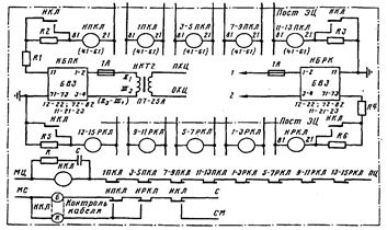 Схема (рис.3.5) предназначена для контроля исправности четырех питающих (передающих) и четырех релейных (приемных) кабельных цепей. Имеются две идентичные схемы контроля, в одну из которых включены питающие цепи, а в другую - релейные. Каждая из них состоит из последовательно соединенных источника питания, в качестве которого используется блок БВ (БВ3), и контрольных реле, включенных между контролируемыми цепями. Одно из крайних контрольных реле (11-13 ПКЛ или 13-15 РКЛ) подключено между контролируемой цепью и заземлителем, а другое (НПКЛ или НРКЛ) - между кабельной цепью и одним из полюсов блока питания. Основное назначение реле НПКЛ и НРКЛ - не нарушать симметрию первых по схеме кабельных цепей.