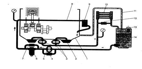 1 - масляный поддон, 2 - масляный насос, 3 - редукционный клапан масляного насоса, 4 - масломерный щуп, 5 - промежуточная шестерня, 6 - масляный фильтр, 7- редукционный (температурный) клапан, 8 - масляный радиатор, 9 - сливной клапан, 10 - распределительный вал, 11 - манометр, 12 - ось коромысел, 13 - главный масляный канал, 14 - полость шатунной шейки, 15 - коленчатый вал, 16 - масло заливная горловина