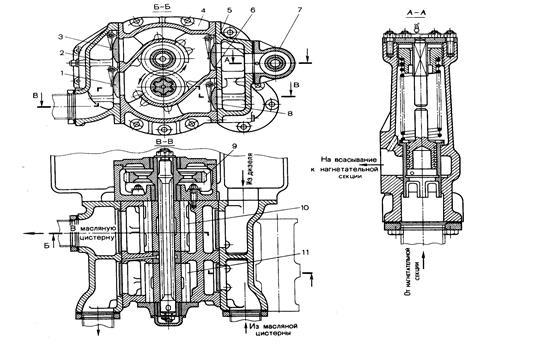 Устройство масляного насоса судового реверсивного дизеля показано на рисунке. В корпусе 4 насоса расположены откачивающая 10 и нагнетательная 11 секции, нижние зубчатые колеса которых приводятся в движение зубчатым колесом 9. В клапанных коробках 2 и 5 смонтированы по четыре нагнетательных / и 3 и всасывающих 6 и 8 клапана. При указанном стрелками направлении вращения зубчатых колес секция 10 откачивает масло из картера дизеля через нижний клапан 8 и нагнетает его через верхний клапан 3 в масляную цистерну. Секция 11 при этом нагнетает масло из цистерны через нижний всасывающий и верхний нагнетательный клапаны в дизель. При обратном направлении вращения зубчатых колес в случае реверсирования двигателя откачивающая и нагнетательная секции засасывают масло из дизеля и цистерны через верхние всасывающие клапаны и нагнетают его через нижние нагнетательные клапаны соответственно в цистерну и дизель.