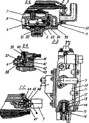 Корпус 10 представляет собой литую конструкцию, выполненную из алюминиевого сплава. Он состоит из следующих полостей: А — полость испарителя; Б — полость первой ступени; В — полость второй ступени; Г — полость разгрузочного устройства; Д и Е — полости атмосферного давления; Ж — полость холостого хода. Сзади и спереди на корпусе имеются крышки 8 и 11, сообщающиеся с атмосферой.