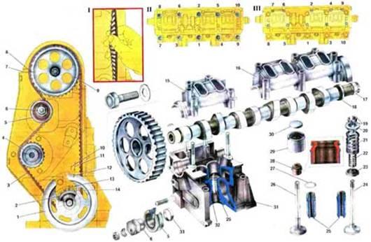 Распределительный вал 18, управляющий открытием и закрытием клапанов, расположен в головке цилиндров и приводится во вращение от коленчатого вала зубчатым ремнем 3. Клапаны приводятся в действие непосредственно кулачками распределительного вала через цилиндрические толкатели 29 без промежуточных рычагов. В гнезде толкателя находится шайба 30, подбором которой регулируется зазор в клапанном механизме.