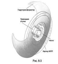 Обычно, насосы располагают между гидротрансформатором и коробкой передач и приводят через корпус гидротрансформатора и приводную втулку (рис.6-3) непосредственно от коленчатого вала двигателя. Таким образом, если двигатель не работает, то насос не может создавать давление в гидросистеме управления АКПП.