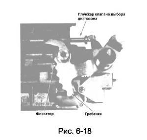 Этот клапан имеет механическую связь с рычагом селектора режимов, установленного в салоне автомобиля. Перемещение селектора через механическую связь передается клапану выбора режима, каждое положение которого фиксируется с помощью специального механизма - гребёнки, поджимаемой пружинным фиксатором (рис.6-18).
