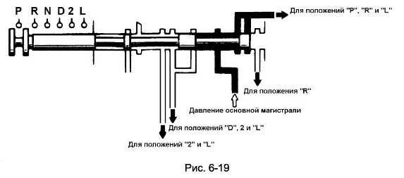 Основная задача клапана выбора режима распределить поток ATF таким образом, чтобы жидкость подводилась только к тем клапанам переключения, которые используются для включения разрешенных в данном режиме передач. К клапанам переключения передач, включение которых запрещено в выбранном режиме, ATF не подводится (рис.6-19).