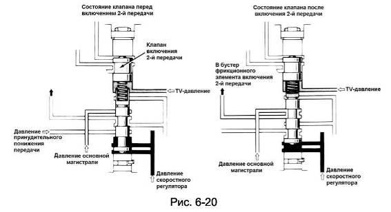 После того, как произошло повышающее переключение (1-2 или 2-3), в соответствующем клапане переключения (1-2 или 2-3) происходит блокировка канала подвода давления клапана-дросселя (рис.6-52). В этом случае силе давления скоростного регулятора, действующей на торец клапана переключения, противодействует только усилие сжатой пружины. Такая отсечка TV-давления от клапана переключения действует как фиксатор для предотвращения включения пониженной передачи и устраняет возможность возникновения колебательного процесса при переключении передач.