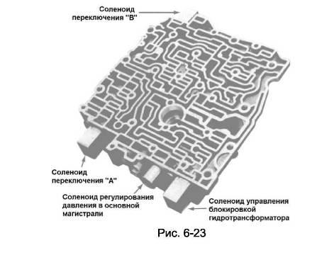 принудительного понижения передачи (рис.6-53). При наличии сигнала управления соленоид открывает дополнительный канал подвода максимального TV-давления к клапану переключения.