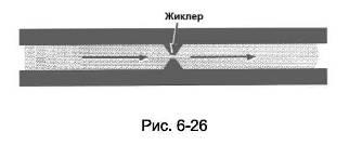 При поступлении жидкости из правой входной магистрали шарик перекатывается и садится в левое седло клапана, перекрывая тем самым доступ жидкости в левую входную магистраль (рис.6-16а). ATF из правой входной магистрали через клапан направляется в выходную магистраль. В случае, если жидкость подводится к клапану через левую входную магистраль, шарик перекрывает правую входную магистраль (рис.6-16б), обеспечивая тем самым доступ ATF из левой входной магистрали в выходную магистраль.