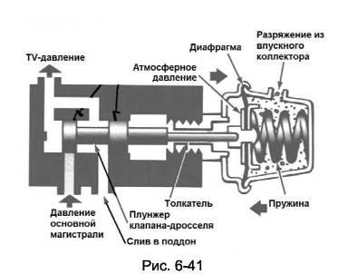 Для получения давления, зависящего от загруженности двигателя, используется клапан-дроссель, который, чаще всего располагается в клапанной коробке. Управление этим клапаном на различных моделях АКПП осуществляется двумя различными способами. В соответствии с первым способом используется механическая связь между дроссельной заслонкой двигателя и клапаном-дросселем. В качестве механической связи может использовать либо трос, либо система тяг и рычагов. Во втором способе для управления клапаном-дросселем используется вакуумный модулятор. Модулятор с помощью трубки соединен с задроссельным пространством впускного коллектора двигателя. Степень разряжения во впускном коллекторе и является задающим параметром для получения давления, пропорционального степени загруженности двигателя. Чем выше загрузка двигателя, тем выше давление, которое формирует клапан-дроссель. Часто давление клапана-дросселя называю TV-давлением, что происходит от английского словосочетания «ThrottleValvepressure».