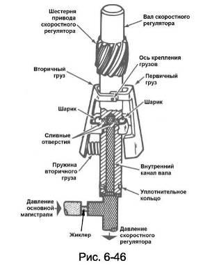 Начиная с определенных оборотов, скоростного регулятора центробежная сила, которая, как известно, зависит от квадрата частоты вращения, становится весьма большой. Так, например, двукратное увеличение оборотов увеличивает центробежную силу в четыре раза. Поэтому становится необходимо принять меры к снижению влияния центробежной силы на формируемое скоростным регулятором давление. Жёсткость пружин подобрана таким образом, что, примерно, на скорости движения 20 миль/ч (16 км/ч), центробежная сила первичных грузов превышает силу пружины, и они отклоняются в крайнее положение и упираются в ограничители (рис.6-44б). Первичные грузы в таком положении не воздействуют на вторичные и становятся неэффективными, а клапан скоростного регулятора на втором этапе уравновешивается центробежной силой только вторичных грузов и силой пружины.