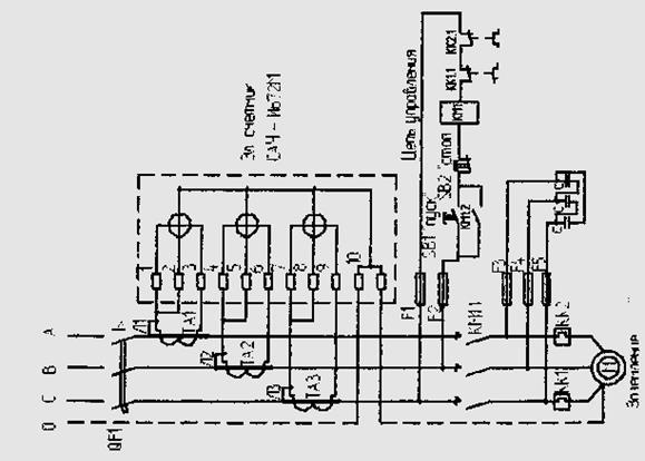 Рис. 2. Схема нереверсивного управления асинхронным электродвигателем с короткозамкнутым ротором: Р1 и Р2 - предохранители в цепи управления; РЗ, Р4, Р5 - предохранители в цепи батареи конденсаторов; рР1 - автоматический выключатель; ТА1, ТА2, ТАЗ; - измерительные трансформаторы тока; КМ - магнитный пускатель; КК1, КК2 - тепловые реле магнитного пускателя; М - асинхронный электродвигатель; С - батареи конденсаторов
