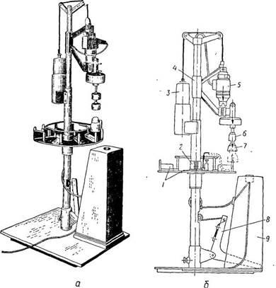 — загальний вигляд: б — будова; 1 — поворотний стіл з дванадцятьма гніздами для встановлення в них гачків; 2