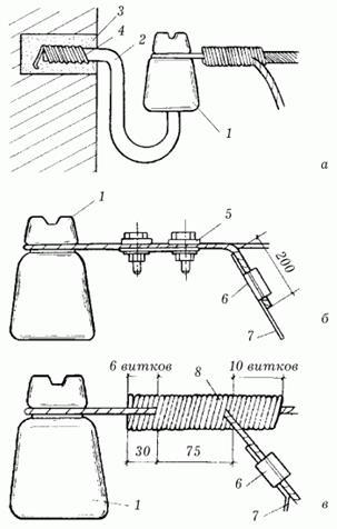 : а – кріплення крюків і ізоляторів до стіни; б – кріплення дроту до ізолятора затиском; у – кріплення дроту до ізолятора в'язкою: 1 – ізолятор; 2 – крюк; 3 – цементний розчин; 4 – дріт; 5 – затиск ПАБ; 6 – затиск ОАС; 7 – дріт введення; 8 – в'язка.