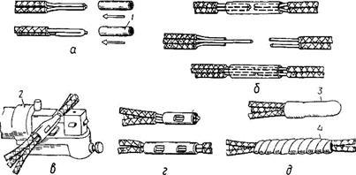 (рис. 15, б) звільнені від ізоляції і зачищені кінці проводів обтискують за допомогою плоскогубців обоймою із куска штабової сталі розміром 20X160 і завтовшки 0,8—1 мм так, щоб кінці зварюваних проводів виступали з обойми на 3—4 мм, а потім зварюють у полум'ї дуги, утвореної між вугільними електродами кліщів, приєднаних до зварювального трансформатора. Після остигання металу знімають обойму, зачищають сталевою дротяною щіткою з'єднані кінці і вкривають їх гліфталевим або асфальтовим лаком, розгинають жили (якщо електропроводка відкрита), а потім ізолюють з'єднання ізоляційною стрічкою або вініпластовим ковпачком і вдруге вкривають лаком.