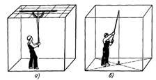 Виконання розмітки місць установки світильників безпосередньо на стелі (а) і методом перенесення точок з підлоги на стелю (б)