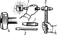 Спосіб пробивання гнізд і отворів монтажним зубилом 1, скарпелю 3, молотком 2 або кувалдою 4 вимагає значних витрат праці, тому його застосовують, коли механізований інструмент іпристосування використовувати неможливо або недоцільно