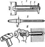 Пробивання гнізд у цегляних і бетонних основах виконують оправленням ОПКМУ (/) із пробійником (//), яку встановлюють в отвір 3 стрижня 2. Поліетиленовий чехол / оправлення має стопорний гвинт для втримання пробійника в ній. Для пробивання гнізд Ø 5,8 і 7,8 мм застосовують ручні пробійники відповідно ПО-1В1 іПО-2В1, якими заготовляють отвору під дюбелі (///)