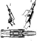 Отвори й гнізда висвердлюють електросвердлильними машинами з подвійною ізоляцією пістолетного типу (/), з бічною рукояткою (//), двома рукоятками й упором. Свердла виконують із твердосплавними пластинками. При утрудненому свердлінні будівельних основ (бетон з абразивним наповнювачем або інші причини) до свердлильних машин виготовляють спеціальні насадки (///) ударно-обертальної дії.