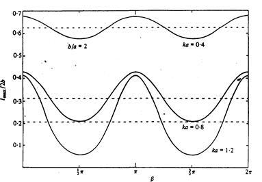 На рис. 4 показана зміна klmax з ka в той час, як рис. 5 показує безрозмірну зміну ширини захвата щодо діаметру диска. Можна побачити, що максимальне значення klmаx відбувається в першому нулі поки klmах зменшується до нуля при ka = 3,83 відповідно до першого нуля B (ka). Наступні нулі А(ka), B (ka) викликають коливальну поведінку klmax зі збільшенням ka. Найкраще це показано при відношенні ширини захвата lmax/2a зі зміною ka. Ефект позначення, який включає А (ka) дає абсолютний максимум відношення ширини захвата приблизно 0,4 у потрібному діапазоні при ka == 0,7 або відношення довжини хвилі до діаметра приблизно 5. Також показана крива (2ka) -l отримана з (2.24), приймаючи, що резонанс може бути досягнутий при всіх частотах. Як очікується єдина точка контакту з кривою lmax/2a знаходиться в першому нулі А(ka).