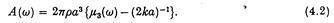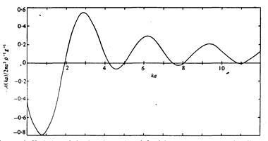 Граф виразу в фігурних дужках в (3.10) показаний на рис. 3 проти ka. Здається, що А(ka) має тільки сім нулів, перший з яких є ka = 1,96 відповідно до радіуса диску приблизно три десятки довжини хвилі. Перший нуль B (ka) відбувається в ka = 3,83.