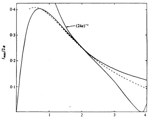 Рис. 4. Зміна klmax з безрозмірним хвильовим числом ka, для циркулярного поглинання коливальних поверхневих розподілів тиску (суцільна лінія) і циркулярного поглинання твердого диску (пунктирна лінія).