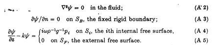 З цього випливає, що всі результати, які зв’язують властивості вимушеного руху твердого тіла в даному способі (Ньюман 1976), або ряд незалежно коливающихся твердих тіл (Срокоз 1979), відповідають задачі дифракційного розсіювання області набігаючої хвилі таким тілом або тілами, мають аналогію в поверхневих розподілах тиску. Відповідність буде, якщо тверді тіла прийняті як тонкі горизонтальні пластини, які роблять одиничні вертикальні коливання у вільній поверхні. Хоча вимагається, щоб к дорівнювало нулю в (А11) у цьому випадку, це не торкається результатів, які отримані за допомогою теореми Гріна. Відповідність завершується відзначенням, що вертикальна захоплююча сила на Sі, тільки iwpk-1qdi, тобто пропорційна об’єму потоку через Sі.
