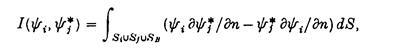 де інтегрування по і-й та j-й внутрішній вільній поверхні, а також по твердій границі SB. Тепер поверхня інтегрування (А20) може бути закрита більшим, вертикальним круглим циліндром Sc, який охоплює всі вільні поверхні та тверді границі і тягнеться від вільної поверхні вниз. Починаючи з y і , y j поведінка подібна убігаючій хвилі на більших відстанях, не дає додаткового внеску в (А20), отримується з інтегралу по Sc. Також, немає внеску від інтегралу по SF або по Sk, k = 1, ..., N, k ¹і, k ¹ j. Отже з (А19) витікає, що: