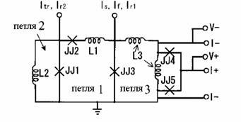 , і зчитування SQUID, що складається з переходів J7 і J8 і напруги на виході терміналу між ними.