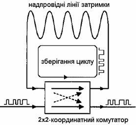 Рис. 26. Конфігурація лінії затримки пам’яті. Ця пам’ять складається з надпровідної лінії затримки і 2*2 координатний комутатор.