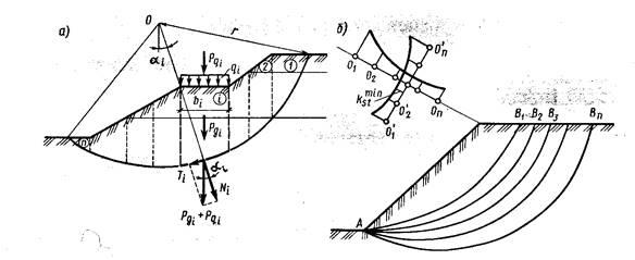 При устойчивость отсека массива грунта относительно выбранного центра вращения 0 считается обеспеченной. Основная сложность при практических расчетах заключается в том, что положение центра вращения 0 и выбор радиуса r, соответствующие наиболее опасному случаю, неизвестны. Поэтому обычно проводится серия таких расчетов при различных положениях центров вращения и значениях r. Чаще всего наиболее опасная поверхность скольжения проходит через нижнюю точку откоса или склона. Однако если в основании залегают слабые грунты с относительно низкими значениями прочностных характеристик j и с, то это условие может не выполняться.