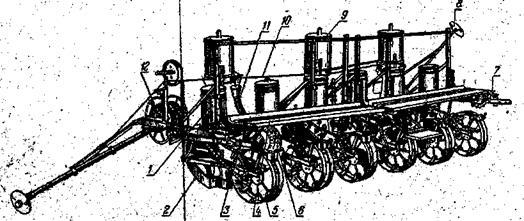 Сеялка (рис. 4) состоит из шести секций, левого и правого узлоуловителей 7, туковысевающих аппаратов 9, механизмов передач и распределения, двух дисковых маркеров, двух натяжных станций, катушки 12 с мерной проволокой, опорных колес 6 и рамы с подножной доской 4.