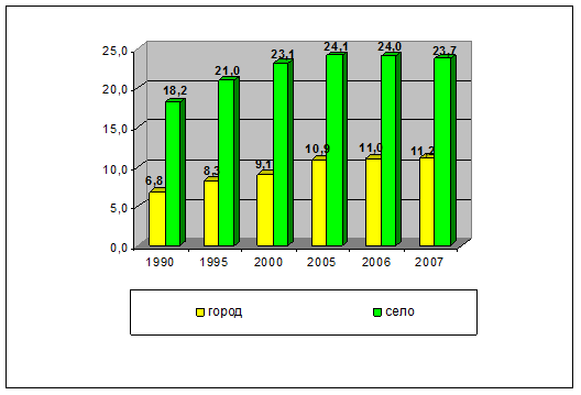 График 6: Динамика коэффициента старения населения в городской и сельской местности, %