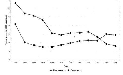 В целом в послевоенное время демографическое развитие России было весьма непростым и требует пояснений. Еще в 40 г. Россия по уровню рождаемости занимала позиции выше среднего уровня по стране (имеется в виду СССР), хотя и ненамного. Война отбросила нас далеко назад. Еще 1960г. Россия находилась на уровне ниже среднего в СССР и только потом заняла место на грани расширенного воспроизводства.