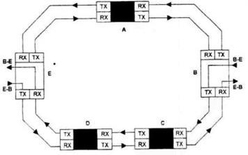 На рис. 8. приведена схема двунаправленного кольца с двумя волокнами, в которой показано, как сигналы двунаправленной связи (например, от В к Е или от Е к В) в условиях нормального функционирования пересекают одни и те же секции кольца, поэтому в случае повреждения поражаются оба направления.