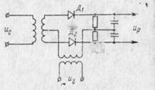 cosφ, зависящая от сдвига фаз детектируемых колебаний. Зависимость этой составляющей тока от амплитуд детектируемых колебаний нежелательна. Для устранения этого эффекта используют амплитудные ограничители от фазового детектора. Одна из возможных схем фазового детектора приведена на рис. 9. Один из двух сигналов, в данном случае ис