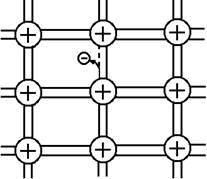 Виявляється, все залежить від того, як стійко тримаються електрони на орбіті. Якщо орбіти електронів у речовині дуже стійкі і електрони не полишають їх за жодних умов (при підвищенні температури, прикладенні до куска матеріалу різниці потенціалів), то ця речовина є типовим ізолятором. Характерною ж властивістю напівпровідників є те, що електрони, в цих матеріалах, можуть залишати свої орбіти внаслідок дії світла, тепла, електричного поля тощо. Схематично, уявимо собі кристал напівпровідника так, як це зображено на рис. 4.
