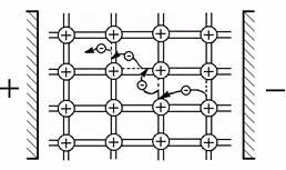 Таким чином позитивно заряджена дірка починає рухатись в напівпровіднику, незважаючи на те, що усі ядра атомів кристалічної решітки надійно перебувають на своїх місцях. Якщо тепер до напівпровідника прикласти напругу (рис.5)