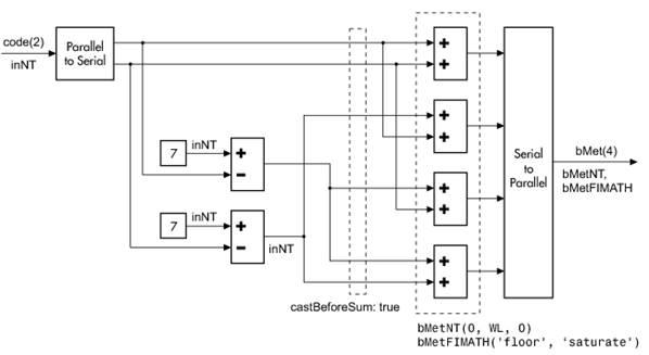 перетворює групу із 8 бітів у вихідний сигнал у вигляді цілих чисел. Для прикладу, при вхідному сигналі [0000011100001101] на виході буде [7,13].Із кадру довжиною 288 вхідних біт отримується послідовність із 36 цілих десяткових чисел.