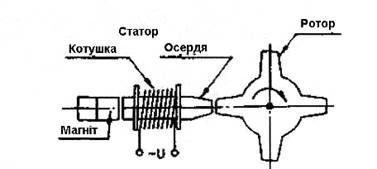 Щодо простоти та стійкості до зовнішнього впливу найбільш привабливі індуктивні датчики. В найпростішому випадку індуктивний датчик складається з котушки з обмоткою, осердя з магнітом’якого заліза та магніта (рис.1).
