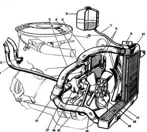 поступает в верхний бачок радиатора. Одновременно часть нагретой жидкости проходит через рубашку впускного трубопровода двигателя, подогревая горючую смесь; при необходимости жидкость может отводиться с помощью крана в отопитель салона кузова. Проходя через сердцевину радиатора в его нижний бачок, нагретая жидкость охлаждается и снова поступает к центробежному насосу.